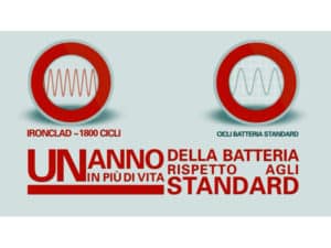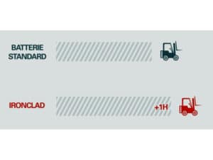 A parità di dimensioni, Ironclad riesce ad avere autonomia maggiore rispetto alle batterie standard: con un 10% di capacità in più garantisce una durata maggiore di un’ora. Considerando che una batteria tradizionale utilizzata su un muletto dura circa 5 ore, Ironclad ne dura 6, di conseguenza, ciò significa un anno in più delle tradizionali (le batterie tradizionali fanno 1500 cicli, questa tipologia ne fa 1800, per cui si stima 1 anno in più rispetto alle tradizionali).